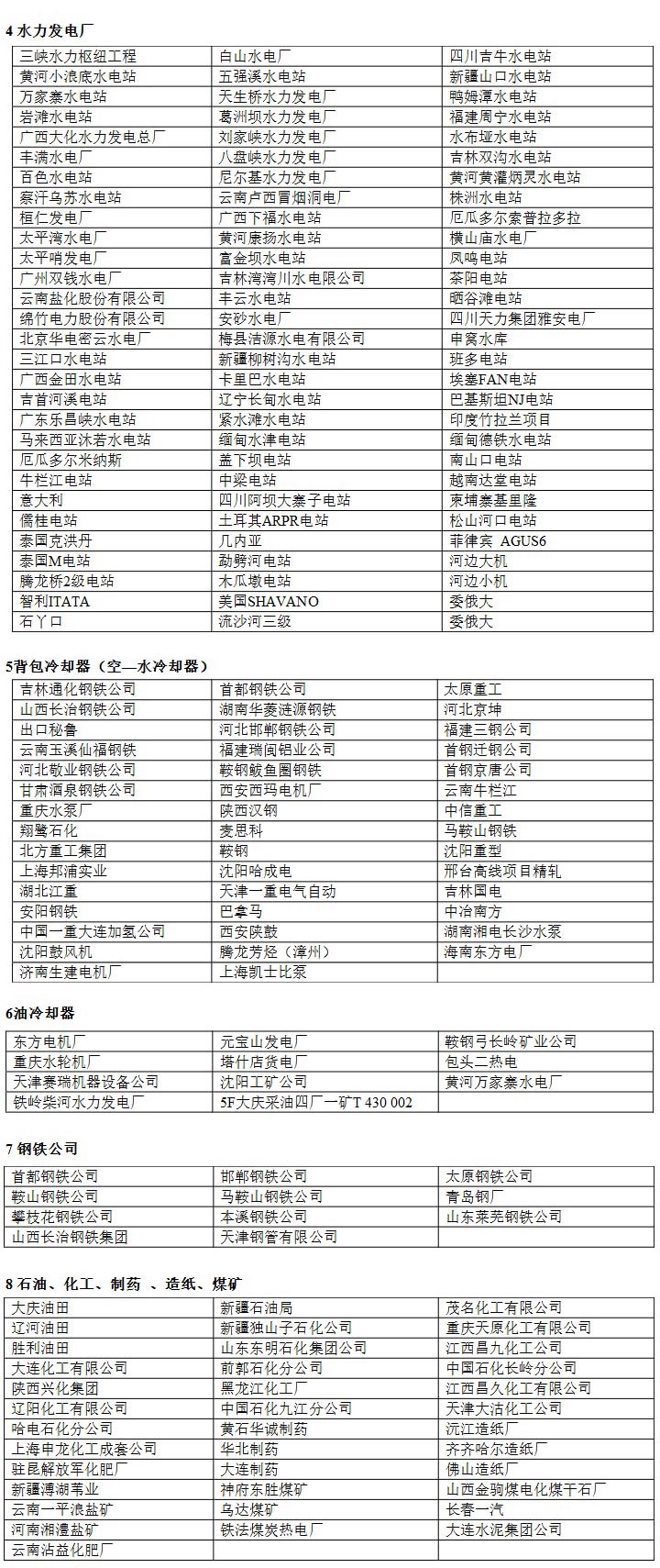 1、哈爾濱電機廠 2、 杭州發(fā)電設備廠 3、東方電機廠 4、北京重型電機廠 5、天津發(fā)電設備廠 6、東風電機廠 7、沈陽電機廠 8、西安西瑪電機廠 9、南京汽輪電機廠 10、 昆明電機廠 11、濟南生建電機廠 12、重慶水輪機廠
